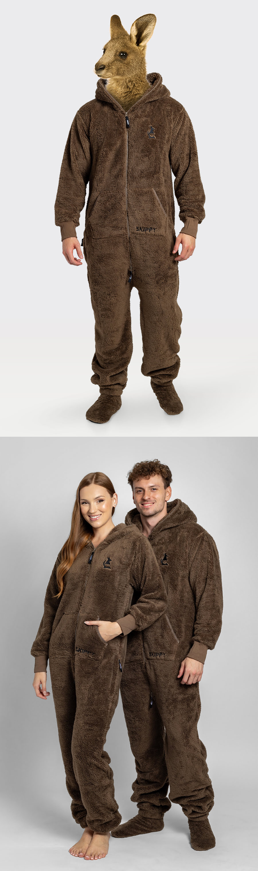 Dupačky Skippy jsou originálním celotělovým overalem, ve kterém můžeš pohodlně lenošit doma anebo vyrazit ven na bláznivou procházku nebo na párty :) Každé dupačky mají na břiše klokanku, dvě postranní kapsy, dlouhý oboustranný zip a kapucu, která se dá kompletně zapnout! Navíc od nás dostaneš ke každým dupačkám i bačkory s protiskluzovou podrážkou zadarmo. Před výběrem velikosti si prohlédni naši tabulku velikostí.